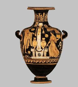 Hydria attica a figure rosse con eros nudo con stola e donna