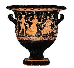 Cratere a campana apulo a figure rosse. Lato A: Dioniso e satiro; Lato B: due giovani ammantati