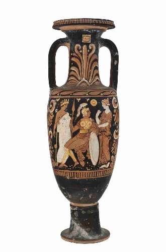 Anfora panatenaica apula a figure rosse. Lato A: scena di offerta. Lato B: due giovani ammantati.