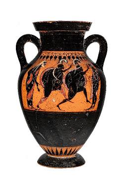 Anfora attica a figure nere. Lato A: combattimento di Eracle contro le amazzoni. Lato B: Dioniso e Arianna