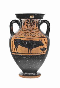 Anfora campana a figure nere. Lato A: toro di fronte a tripode.
