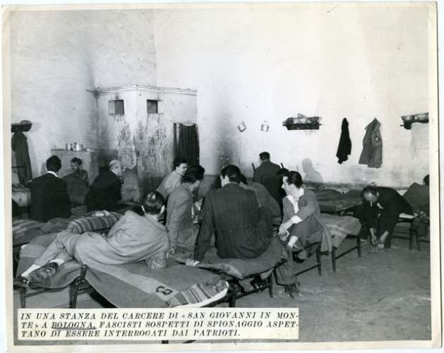IN UNA STANZA DEL CARCERE DI "SAN GIOVANNI IN MONTE" A BOLOGNA, FASCISTI SOSPETTI DI SPIONAGGIO ASPETTANO DI ESSERE INTERROGATI DAI PATRIOTI.