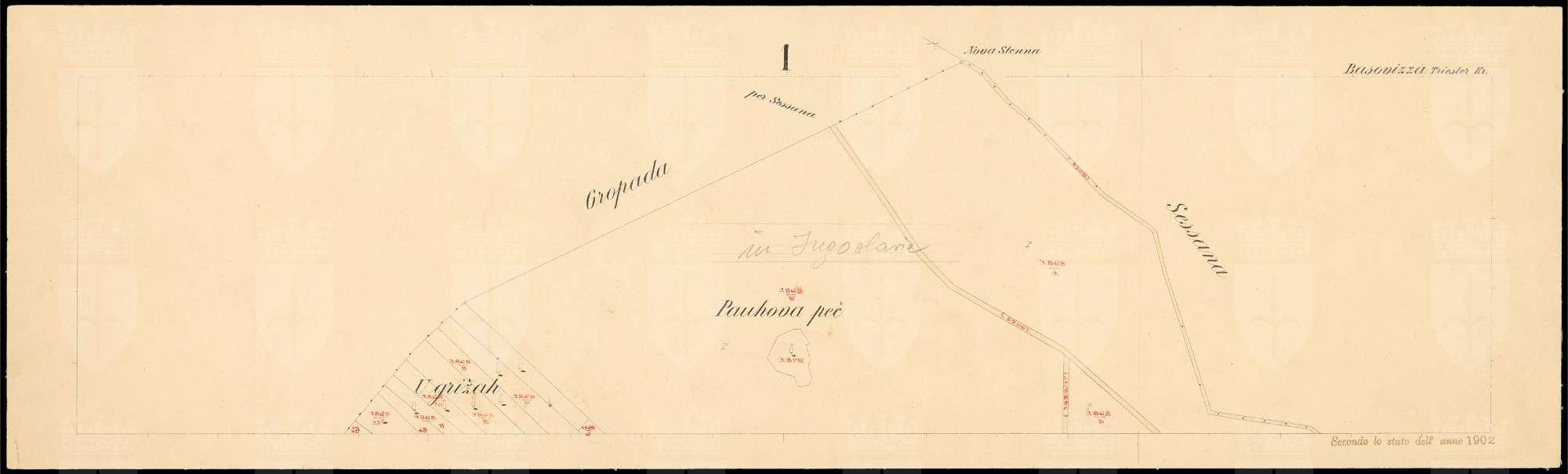 Basovizza nel Litorale Territorio di Trieste : distretto steorale di Trieste : litografato nell'i.r. Istituto litografico del Catasto secondo lo stato dell'anno 1902, misurato nell'anno 1822
