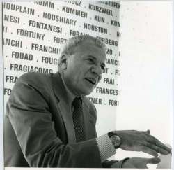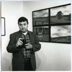 Adriano Perini durante l'allestimento di una mostra
