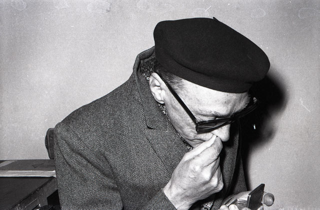 Ugo Borsatti intento in lavori di smacchiatura e rammendo pantaloni