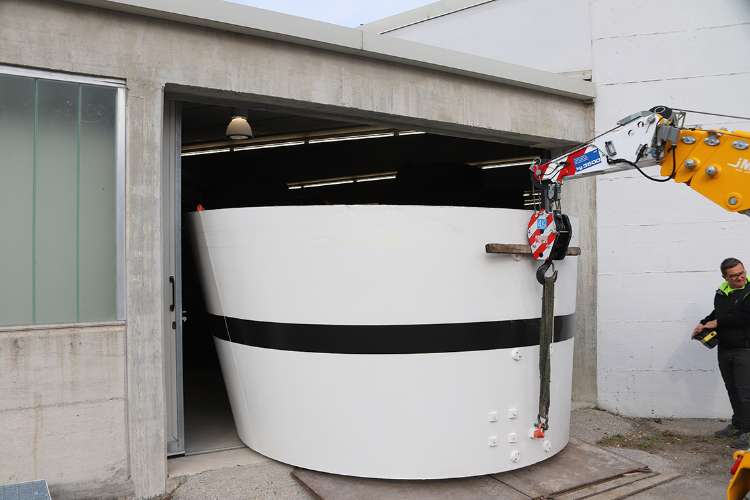Arrivo della copia del batiscafo Trieste da piazza dell'Unità d'Italia al Museo Diego de Henriquez