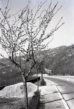 alberi in fiore in via F. Severo (presso curva Faccanoni) con vedute verso la città