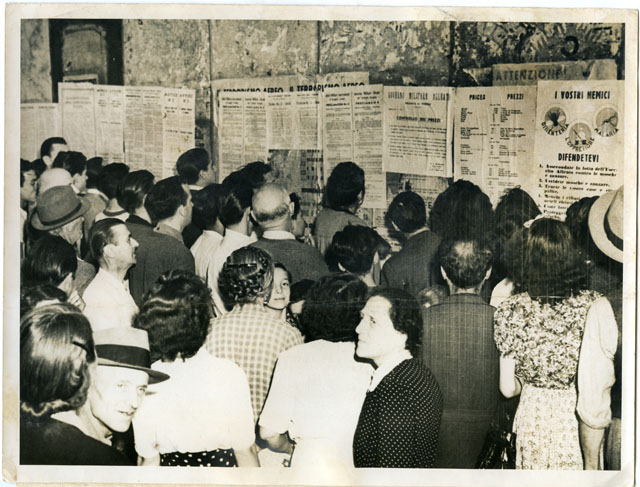 ALLIED MILITARY GOVERNMENT SET-UP IN FLORENCE.- CROWDS READING GENERAL SIR HAROLD R.L.G. ALEXANDER'S PROCLAMATION OF VARIOUS ORDERS OF THE ALLIED MILITARY GOVERNMENT AND THE ALLIED CONTROL COMISSION FOLLOWING THE ENTRY OF SOUTH AFRICAN UNITS INTO THE OUTSKIRTS OF FLORENCE.