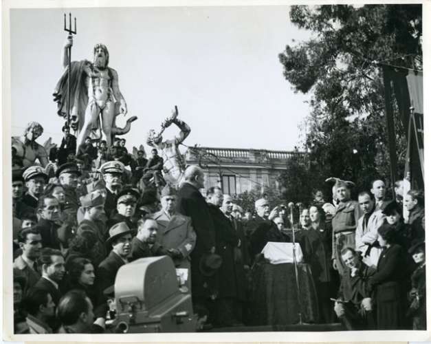 ECCO UNA STATUA FASCISTA RIMODERNΑΤΑ DAI PATRIOTI ITALIANI A GENOVA. LA MANO DESTRA ALZATA NEL SALUTO FASCISTA ESTATA AMPUTATA, MENTRE MANIFESTI DI BENVENUTO ALLE TRUPPE ALLEATE NE ADORNANO IL PIEDESTALLO.