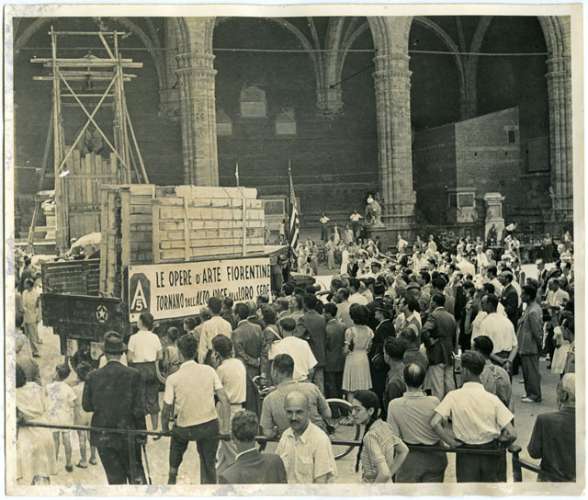 Automezzi della V.a Armata Americana trasportano a Firenze parte degli inestimabili tesori artistici, rubati dai tedeschi alla città e scoperti in un nascondiglio presso Bolzano.