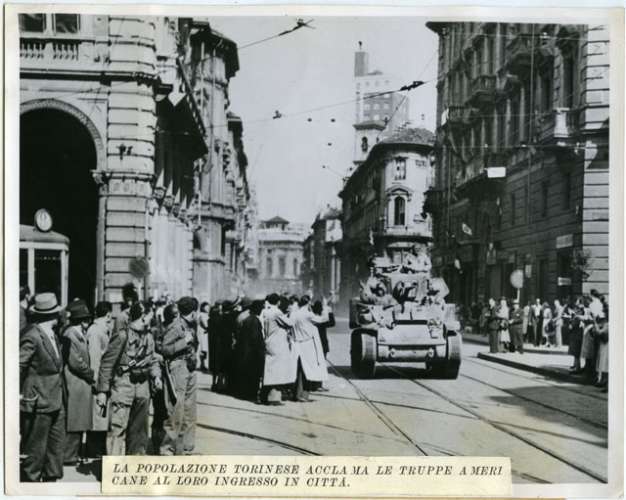 LA POPOLAZIONE TORINESE ACCLAMA LE TRUPPE AMERICANE AL LORO INGRESSO IN CITTA'