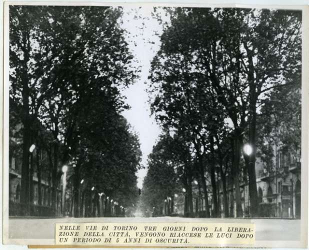 NELLE VIE DI TORINO TRE GIORNI DOPO LA LIBERAZIONE DELLA CITTA', VENGONO RIACCESE LE LUCI DOPO UN PERIODO DI 5 ANNI DI OSCURITA'.