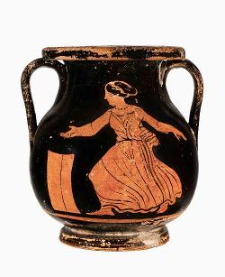 Pelike attica a figure rosse. Lato A: donna. Lato B: giovane in corsa
