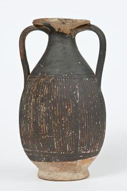 Pelike apula a figure rosse. Lato A: giovane nudo e donna; Lato B: due giovani ammantati