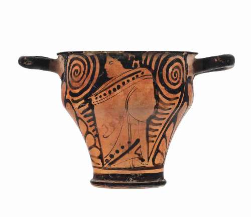 Skyphos campano a figure rosse su ambo i lati: giovane ammantato