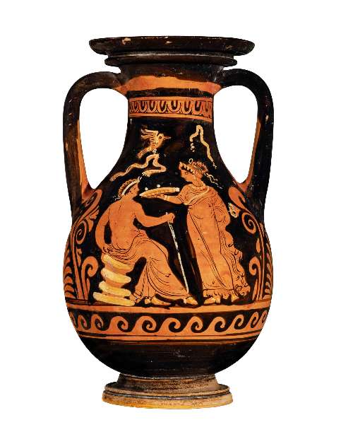 Pelike attica a figure rosse. Lato A: donna. Lato B: giovane in corsa