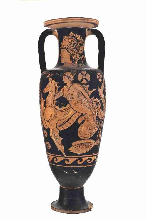 Anfora campana a figure rosse, Lato A: nereide che cavalca un mostro marino; Lato B: due giovani ammantati a colloquio