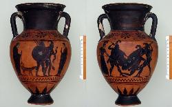 Anfora attica a figure nere. Lato A: combattimento di Eracle contro le amazzoni. Lato B: Dioniso e Arianna