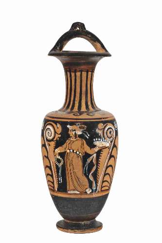 Anfora a candelabro apula a figure rosse con testa femminile e palmetta.