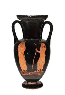 Anfora campana a figure rosse. Lato A: giovane donna che offre una patera a un guerriero; Lato B: due giovani ammantati a colloquio