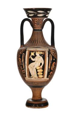 Anfora campana a figure rosse. Lato A: fanciulla che regge corona vegetale e patera; Lato B: figura femminile ammantata