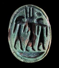 Scarabeo in faience con Horo, Montu e terza divinità, dall'Egitto