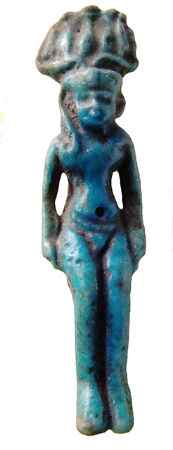 Amuleto in faience raffigurante Arpocrate con anello dietro la nuca, dall'Egitto
