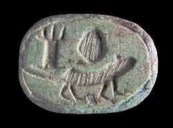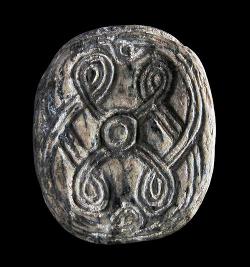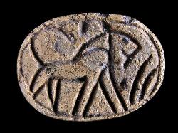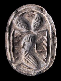 Scarabeo in steatite con due leoni e un uccello, dall'Egitto