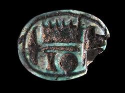 Scarabeo in faience con segni geroglifici non comprensibili, dall'Egitto