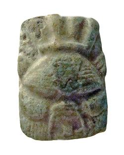 Piastrina quadrata in faience con volto di Bes e divinità alate, dall'Egitto