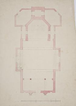 Progetto di chiesa in stile romanico con pianta a croce latina, con campanile posteriore