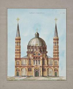 Progetto di chiesa con due campanili laterali e cupola