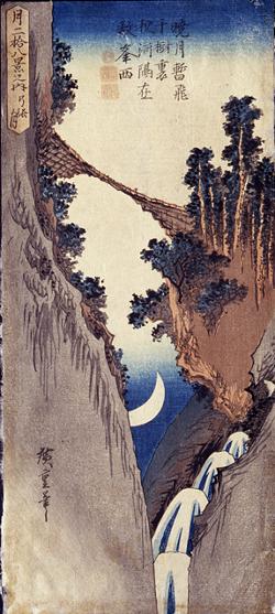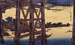 La luna del crepuscolo attraverso il ponte Ryogoku
