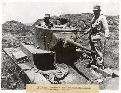 Chinese soldiers examine tank the Japanese used as pillbox