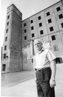 Mario Montanaro in cortile. Edificio centrale e piastra del forno sullo sfondo
