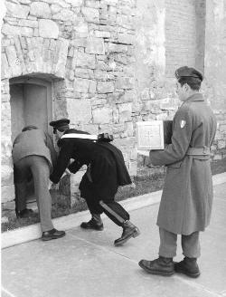 Mario Montanaro in cortile. Edificio camerate prigionieri e "Pietà" sullo sfondo
