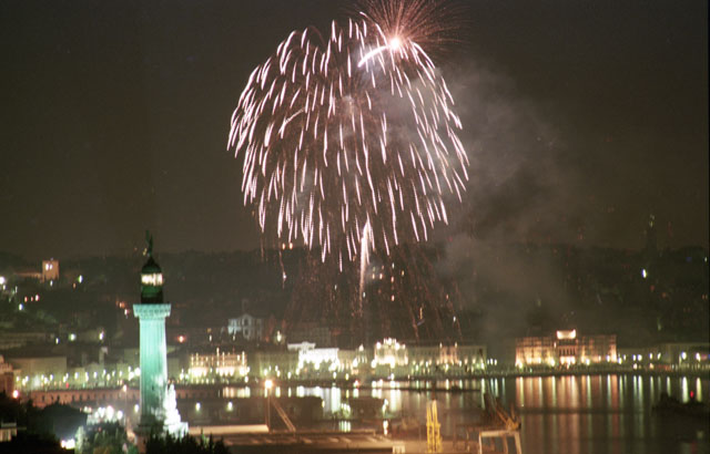 Fuochi d'artificio, rive di Trieste, stazione marittima, Faro della Vittoria, panoramiche Trieste.