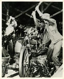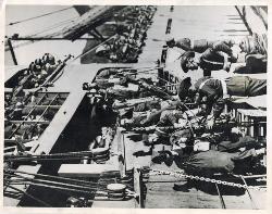 Nell'hangar della portaerei "Saratoga", i caccia vengono spinti in posizione per essere sollevati al ponte di volo