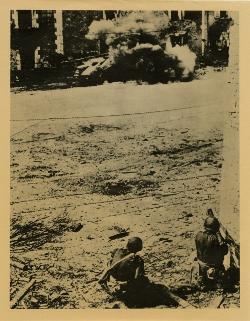 American troops hug the side of a building in Dinard as they advance through the streets under fire from German snipers.