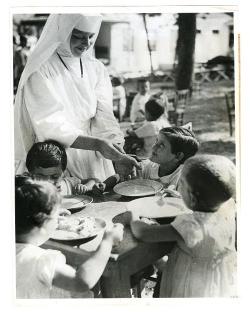 A SMILING NUN FEEDS AN ITALIAN WAR ORPHAN AT AN ITALIAN RED CROSS ORPHANAGE IN ROME