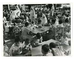 AN OLDER BOY AT AN ITALIAN RED CROSS ORPHANAGE IN ROME LOOKS AFTER A YOUGEST AT THEIR BREAD AND MILK BREAKFAST PROVIDED BY UNRRA