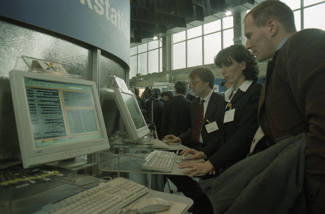 Fiera di Trieste: convegno economia (02/02/01), computer, pranzo, colazione. Esterni fiera, panoramiche.