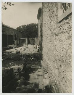 Edificio con abside e vasca, muro medievale che soffoca l'abside a NE e porta, pietra di soglia presso la soglia, muri divisionali di ambienti.