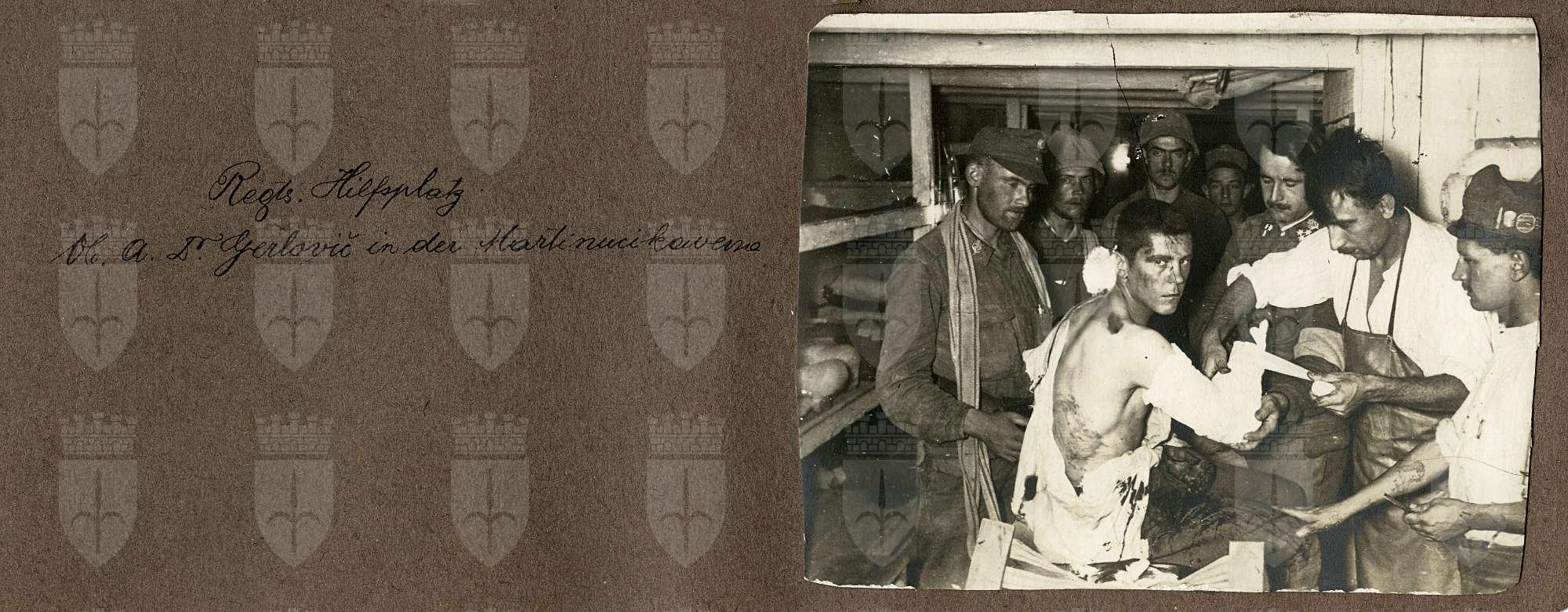 Le fotografie realizzate dal medico Mario Slavich (depositate dal figlio Gianni in formato digitale presso l'Archivio Generale del Comune di Trieste) documentano la sua partecipazione nella prima guerra mondiale. Arruolato nel 1914 venne inquadrato a fine dello stesso anno come soldato della sanità della Leva di Massa con i distintivi da Volontario per un anno nel Imperiale e Regio 9° reparto della Sanità, il cui comando era in via Fabio Severo, nell’ospedale militare di Trieste divenuto oggi un Campus universitario. Arrivato a Celje nel 1916 ebbe la nomina ad Alfiere. Fu attivo sempre come soldato della sanità in più luoghi per venir poi inserito in un reparto d’élite: il 1° Reggimento Gebirgsschützen, un reparto equipaggiato e addestrato per la guerra di montagna, che Slavich seguì al fronte del Carso, vivendo la decima e l’undicesima battaglia dell’Isonzo tra il posto di primo soccorso di Martinuci e la caverna Hindenburg, ai piedi del Faiti, ben riparata dalla quota 113 e posta lungo un sentiero di collegamento che porta alla località di Ozreni. La caverna è ancora ben riconoscibile così come il sentiero che segue una gola fangosa e che è stato parzialmente e grezzamente lastricato dai soldati. Dal Carso Mario Slavich seguì le sorti del reggimento fino al Piave dove si distinse, come già sul Faiti, per il suo impegno umanitario mettendo a rischio la propria stessa vita, anche nella battaglia di Zenson del novembre 1917 prendendo parte al forzamento del fiume. Le sue tracce si perdono con la nomina del 1 febbraio 1918 a Sottotenente della Sanità. Gli ultimi dati disponibili per quanto riguarda il servizio militare lo collocano a Marburg (Maribor SLO).Notizie tratte dal volume Patriae ac Humanitati a cura di Roberto Todero