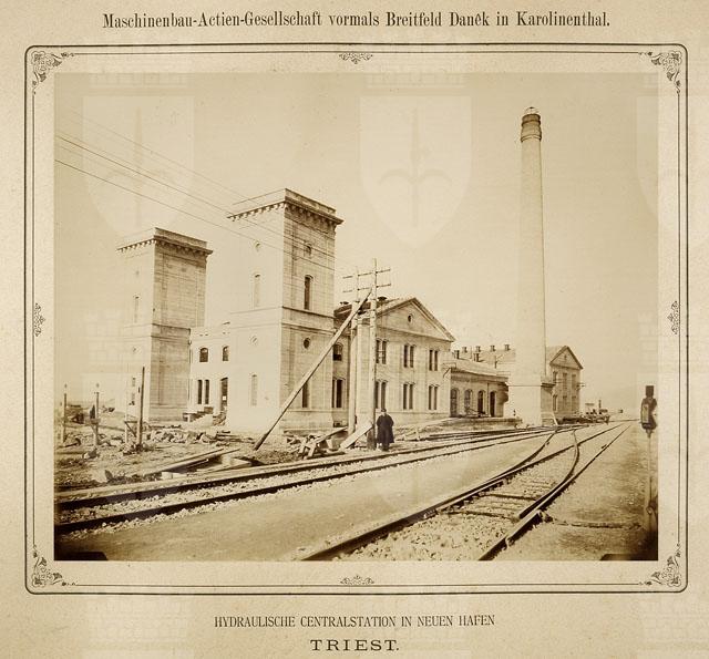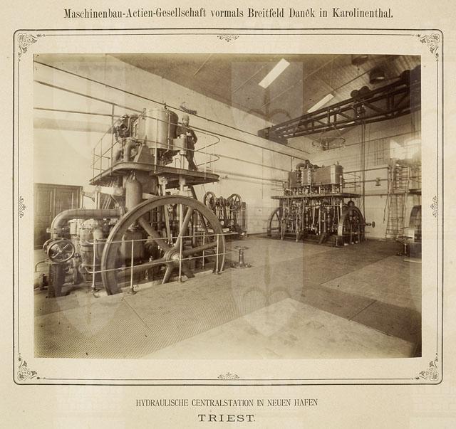 Nel 1891 la Centrale Idrodinamica entra in funzione e fornisce l’energia per il funzionamento di arredi meccanici, gru e montacarichi azionati da acqua sotto pressione1. La fotografia entra nel porto, immortalando l’edificio non solo all’esterno ma anche all’interno, mettendo in risalto la meravigliosa volumetria futurista e la modularità geometrica dei macchinari industriali. I positivi di grandi dimensioni sono elegantemente incollati sul supporto secondario che riporta in alto, al centro, il nome della ditta Maschinenbau-Actien-Gesellschaft vormals Breitfeld Danek in Karolinenthal responsabile della costruzione dei macchinari che ancora oggi si possono ammirare. Le caldaie tipo Cornovaglia, realizzate nel 1891, saranno utilizzate fino al 1988. Testo tratto dal saggio: Vedute e visioni di Porto Vecchio negli scatti della Fototeca dei Civici Musei di Storia ed Arte di Trieste