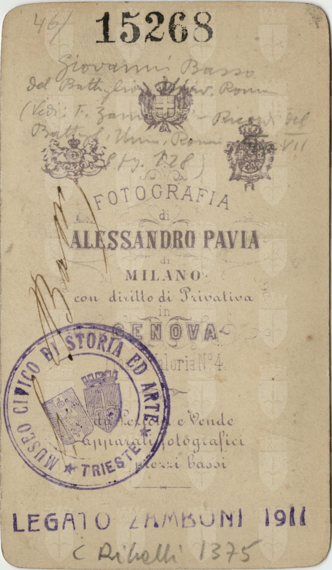 Giovanni Basso (Nizza, 1824-Genova 1884), esule con Garibaldi nel 1834, partecipa alla campagna militare del 1859 nei Cacciatori delle Alpi. Vive a lungo a Caprera ed è segretario di Garibaldi. Combatte nella battaglia del Volturno, nel 1860. Volontario nel 1866, fu insignito della medaglia d'argento al valor militare. Segue ancora il generale nella spedizione dell'Agro romano nel 1867 e ne facilita la fuga a Caprera dopo l'arresto di Sinalunga.