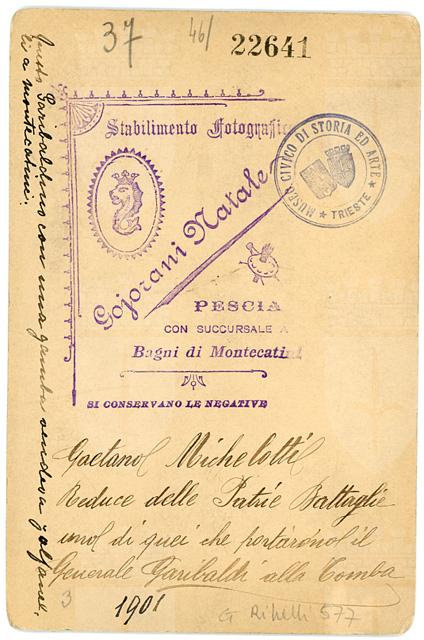 Ritratto a figura intera del garibaldino Gaetano Michelotti. Il soggetto porta al petto quattro medaglie e mostra la presenza di una protesi alla gamba.