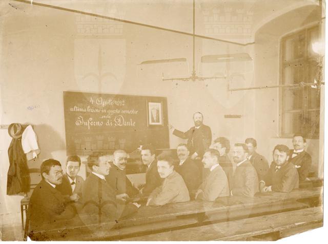 Gruppo di allievi con Filippo Zamboni: ultima lezione in questo semestre sull'Inferno di Dante: Vienna 4 aprile 1892