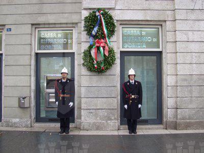L'assessore Fulvio Sluga ed il consigliere Silvano Magnelli commemorano con corone d'alloro le targhe ai Caduti del '53, ai Caduti del 5 maggio '53, la targa Beltramini '45, le targhe ai Caduti antinazisti del '44 ed ai 41 martiri antifascisti del '44