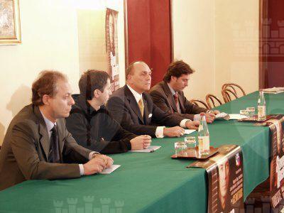L'assessore comunale Maurizio Bucci assieme all'assessore regionale Sergio Dressi e Steve Hackett durante la presentazione del concerto.